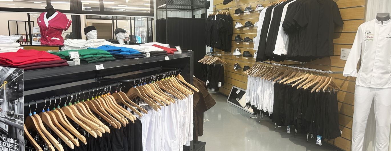 Vous trouverez : pantalon de cuisine, veste de cuisine, marinière de cuisine, tablier de cuisine, toque, ... Pour homme et femme !